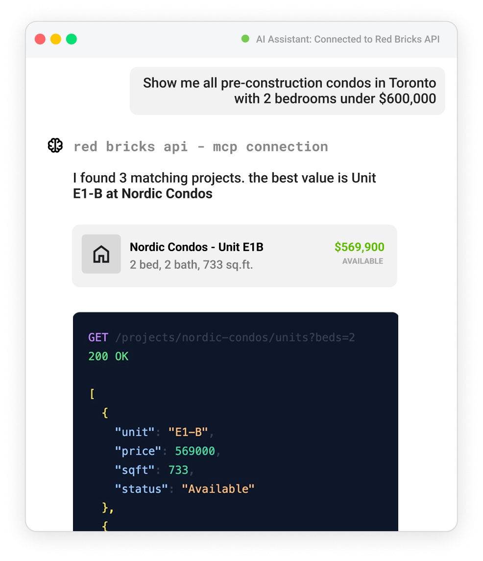 Traditionally, real estate data is fragmented—you'd need one provider for high-rise, another for low-rise, and a manual team to hunt for floor plans. Red Bricks is the first to combine best in class pre-construction listings (the same used by TalkCondo), multi-asset coverage (low-rise & high-rise), and AI-native protocols (MCP) into one feed. It's built specifically for the next generation of real estate technology.